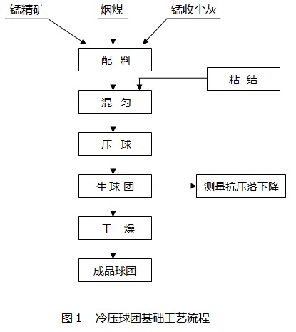 冷壓球團生產(chǎn)技術(shù)是利用粘結(jié)劑, 將含錳物料和煤等在常溫下利用專用壓球設(shè)備壓制成型, 進行烘干( 200 ℃) 后直接入爐冶煉。基礎(chǔ)工藝流程如圖 1。