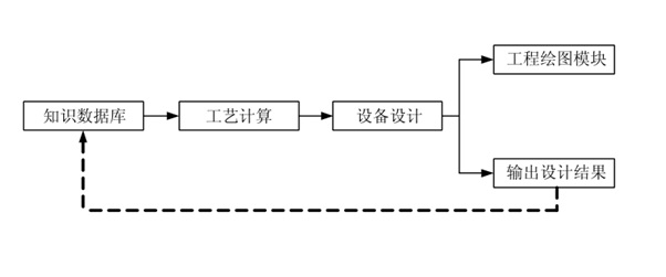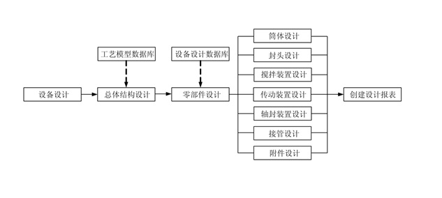 工藝計算后的設計方案作為設備設計的原始條件。首先從工藝模型數據庫中檢索確認和完成總體結構,再結合設備設計數據庫進行具體的零部件設計,主要的設計內容包括: 筒體和封頭設計、攪拌裝置設計、傳動裝置設計、軸封裝置設計等。設計得到的結果保存到設計報表中,后續(xù) CAD 繪圖模塊從中讀取有關數據,繪制或自動生成設備工程圖。具體流程如下圖: